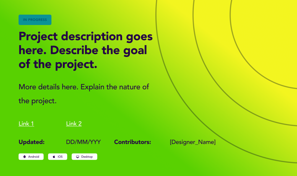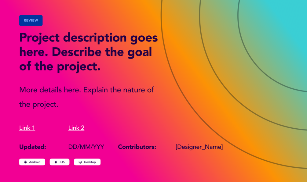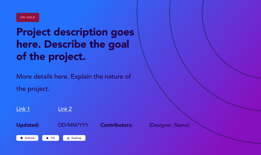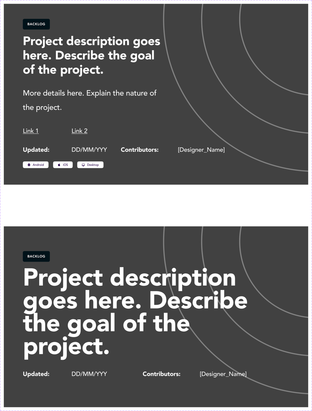 This Figma Cover Template makes it easy for designers to create a uniform look and feel for projects. The files are editable and you can easily swap in your information. Bye bye project covers that look "meeeeh" and welcome to Figma project covers that look dope and informative.